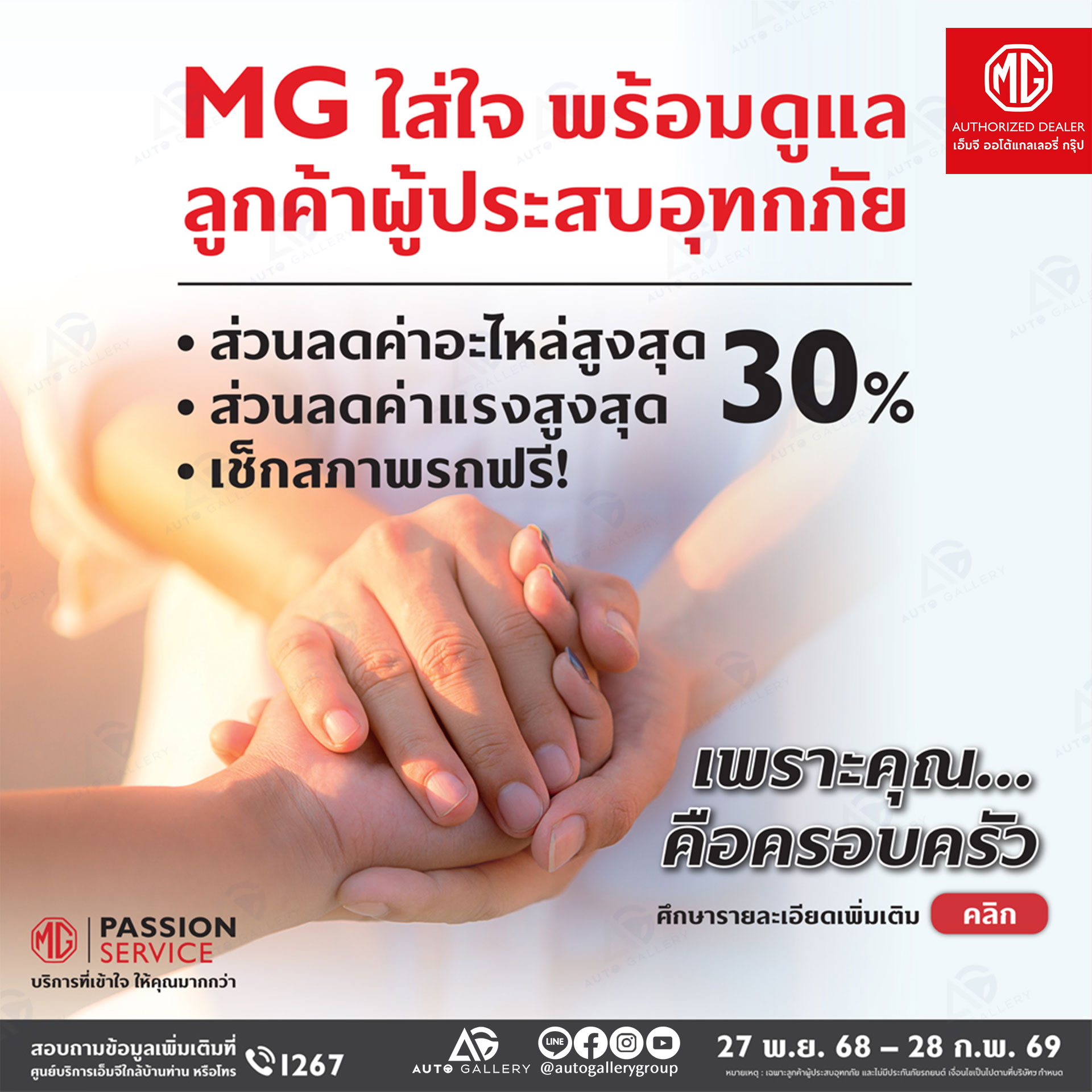 “อย่าพลาด MG โปรโมชั่นเด็ดๆ ไม่ว่าจะดาวน์ 0% หรือเลือกดอกเบี้ยต่ำ ของแถมจัดหนักแบบเต็มๆคัน เรามีบริการให้คำปรึกษากับทุกปัญหาของท่าน เช่น การจัดไฟแนนซ์ หรือเช็คส่วนลดของแถมได้ตลอด พบกันได้ที่ MG ออโต้แกลเลอรี่ทั้ง 5 สาขาใกล้บ้านท่าน ได้แก่ สุขุมวิท62 รามอินทรา หลักสี่ นนทบุรี และหัวหิน อย่าเพิ่งตัดสินใจซื้อ หากยังไม่ได้คุยกับเรา”