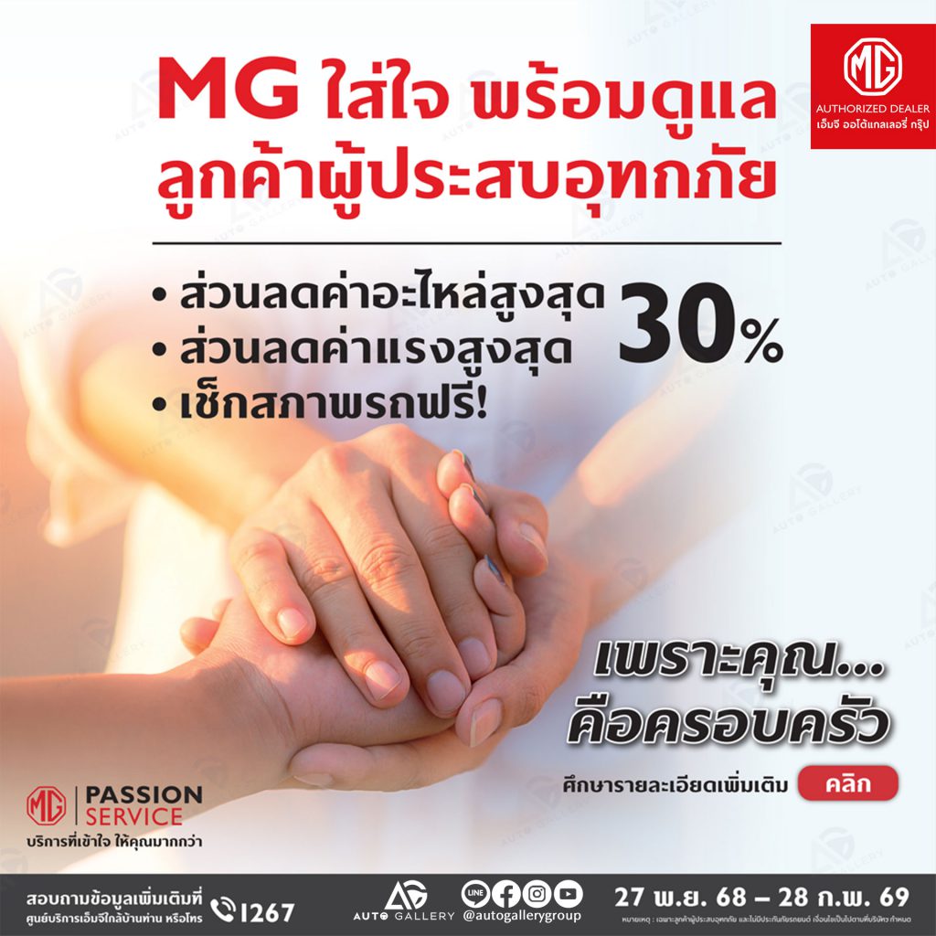 เพราะลูกค้าคือคนสำคัญของ MG เราขอร่วมเป็นส่วนหนึ่งในการช่วยเหลือผู้ประสบอุทกภัยทั่วประเทศ ที่ได้รับผลกระทบจากน้ำท่วมขณะนี้ MG ร่วมแบ่งเบาภาระค่าใช้จ่ายในการดูแลรักษารถยนต์ของคุณด้วยโปรแกรม “MG ใส่ใจ พร้อมดูแลลูกค้าผู้ประสบอุทกภัย” โดยลูกค้าผู้ประสบภัยจะได้รับการบริการดังนี้